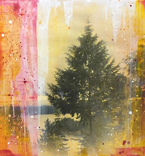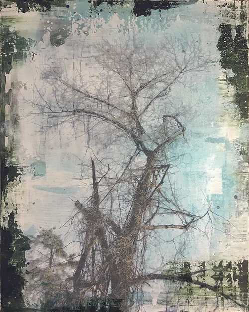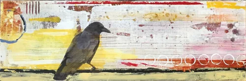 Mixed media: Acrylic and photo transfer on panel with wax.