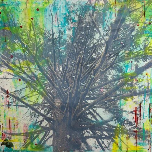 Mixed media: Acrylic and photo transfer on panel with resin.